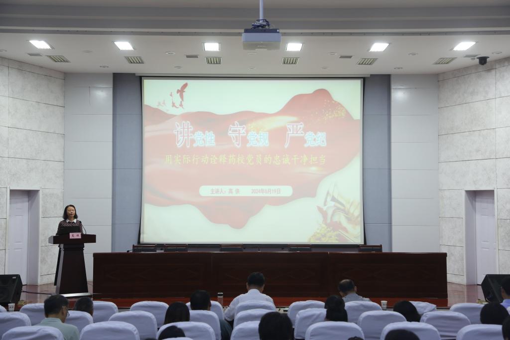 6月19日,江苏省徐州医药高等职业学校党委书记高侠以《讲党性守党规严党纪——用实际行动诠释药校党员的忠诚干净担当》为题为全体党员讲授党纪学习教育专题党课。