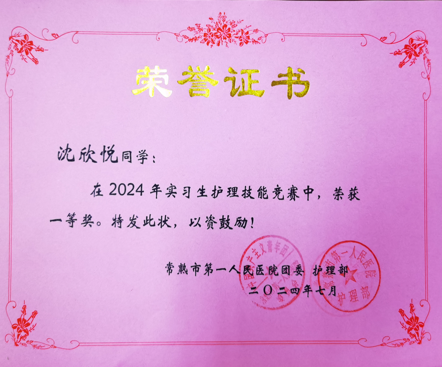 为更好地夯实基础护理,进一步规范实习生临床护理技术操作,激发实习生钻研业务、苦练技能的热情,发掘及培养实习生队伍中的优秀人才,2024年7月22日,常熟市第一人民医院护理部联合院团委对2024年在院实习的全体护理实习生进行了“第一届实习生护理技能竞赛”。我校沈欣悦同学以第一名的成绩斩获一等奖。