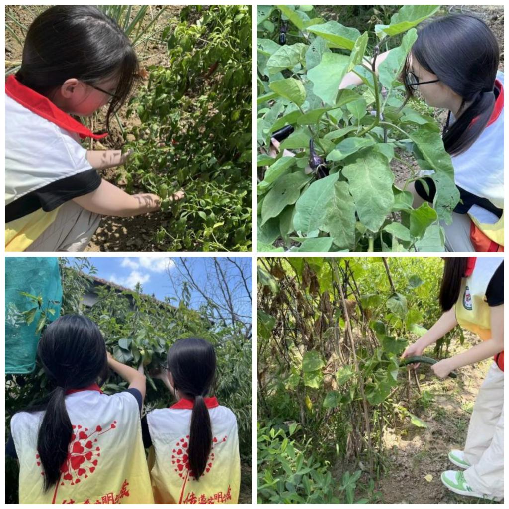 同学们深入间田,开展助农活动。志愿者们头顶烈日,脚踏黄土,汗水浸湿了衣衫,但是热情丝毫不减。他们分工明确,帮助农民采摘成熟的蔬果,并小心翼翼地将其放入筐中,确保果实完好无损。劳作结束,志愿者们教农民们使用手机制作视频记录农村生活,并指导农民利用网络平台进行农产品销售。